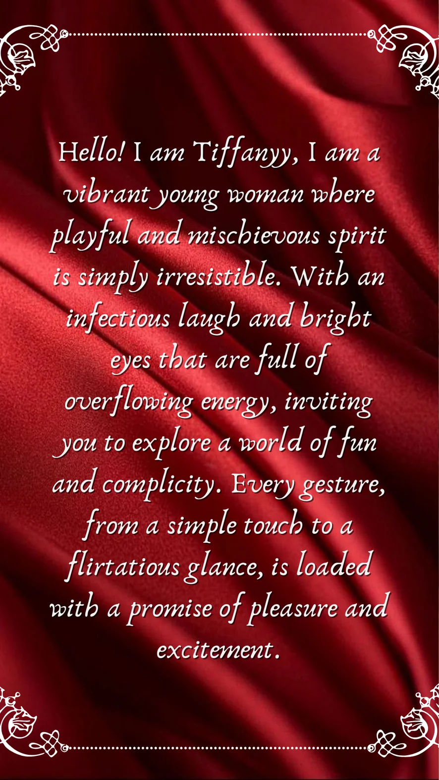 Hi, I'm tiffanyy, a fun, playful girl who wants to meet guys like you, I love role-playing, listening to music, fun conversations, I'm very accommodating and I want to know more about you.