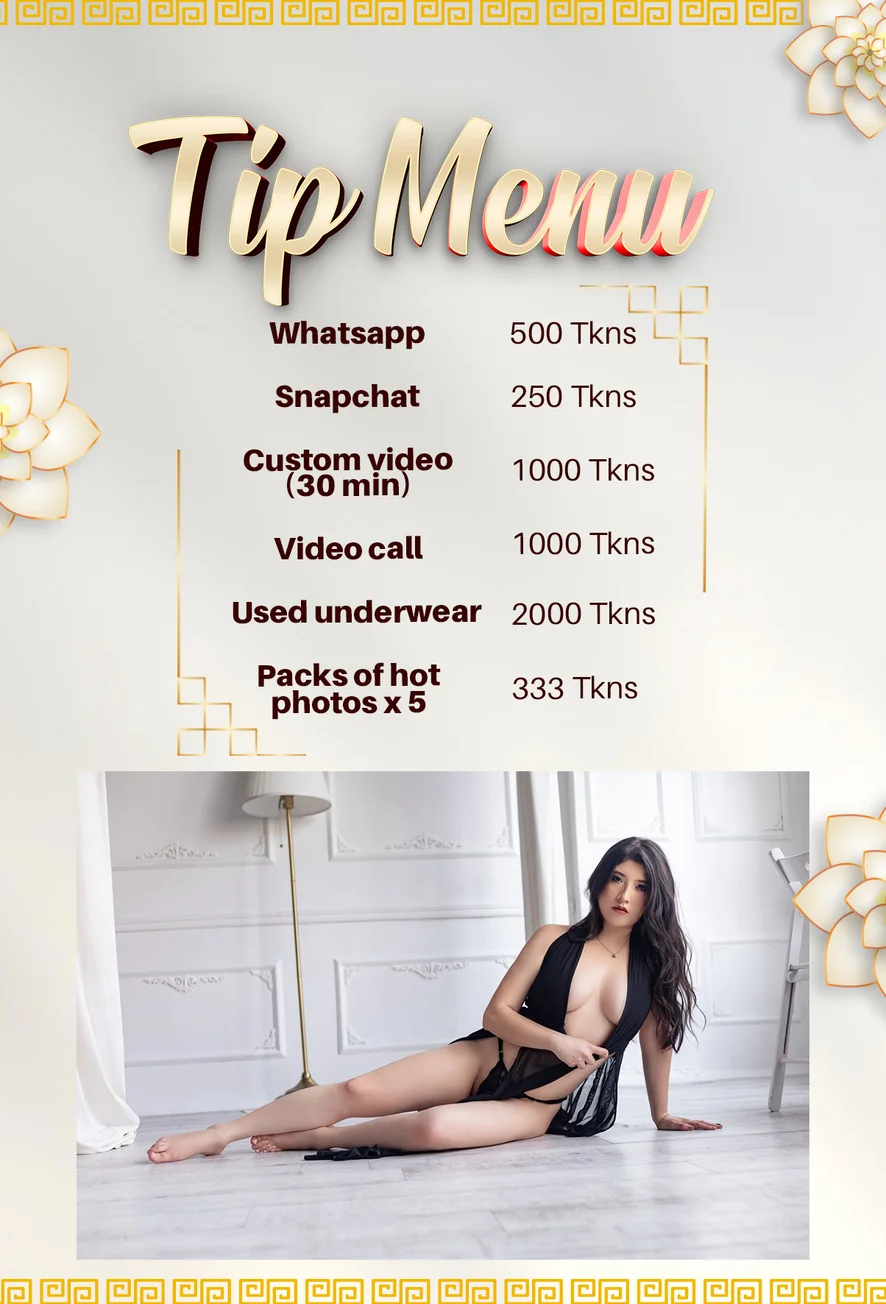 Topless, Heels, Oil Show, Tittyfuck, Striptease, Foot Fetish, Anal, Cuckold, Dirty Talk, Dildo or Vibrator, Double Penetration, Nipple Toys, Upskirt, Squirt, Erotic Dance, Camel Toe, Deepthroat, Nylon, Doggy Style, Masturbation, Role Play, Creampie, Fingering, Blowjob, Spanking, Cock Rating, Jerk-off Instruction